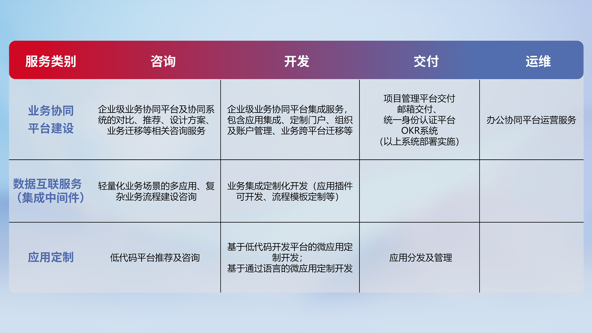 针对钉钉、、、、企微、、IDaas等平台级产品提供产品的规划、、方案、、、交付、、、、定制化开发等服务,,,,实现如统一协同办公、、、智能客户服务、、、、混合会议管理、、、智能数据查询、、等业务场景,,,实现数字化转型。。。。